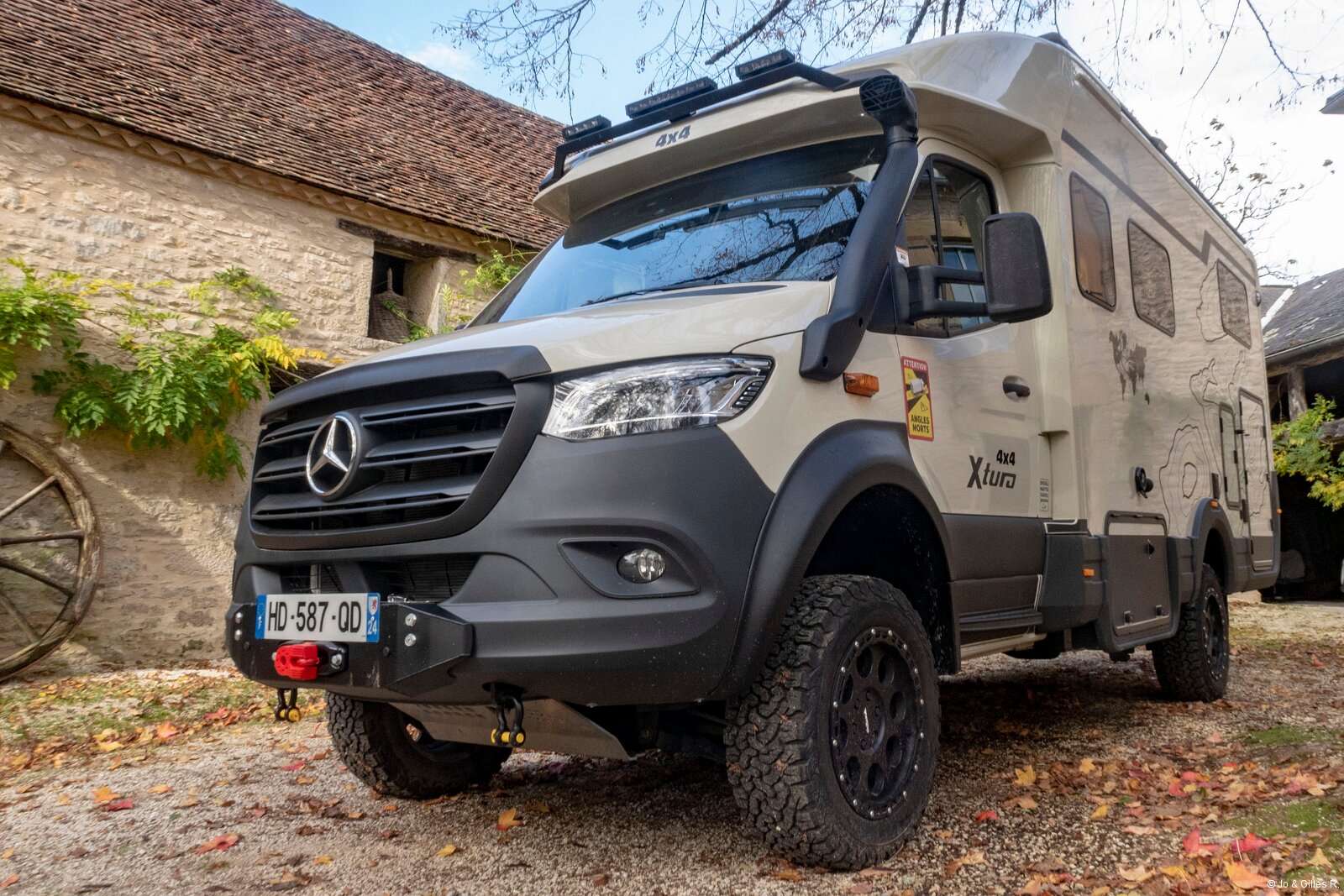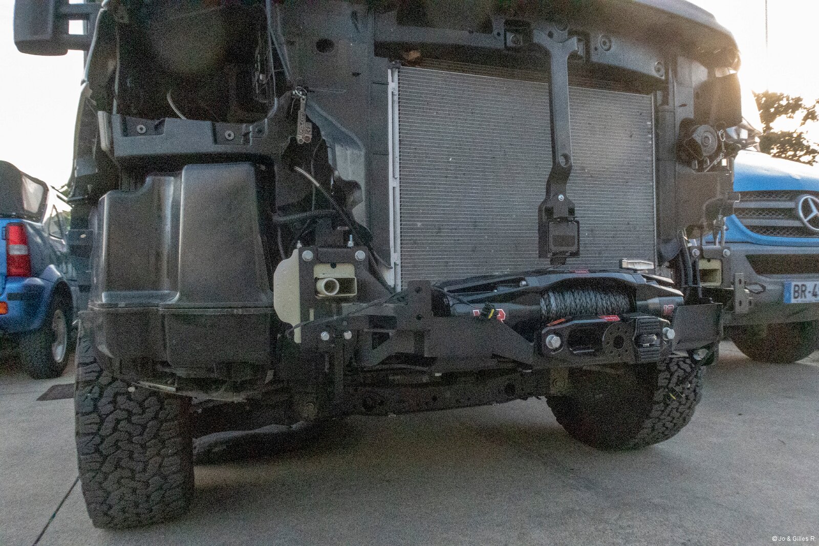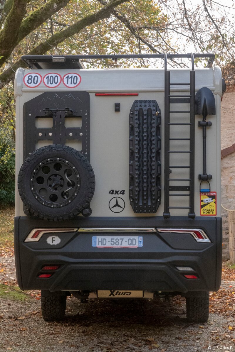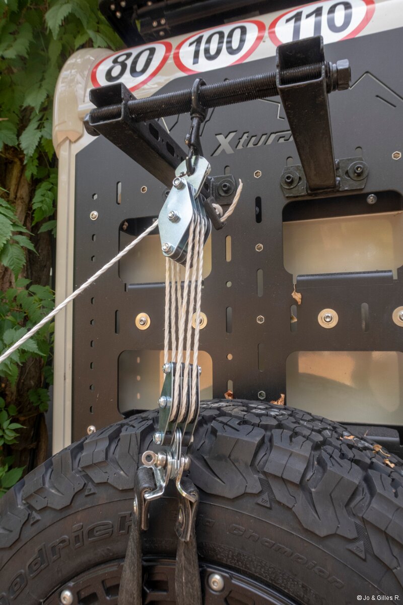 Quatre plaques de désensablage Maxtrax Xtrem + pelle Rhino. La roue de secours a été descendue de 25 cm pour abaisser le centre de gravité du véhicule.