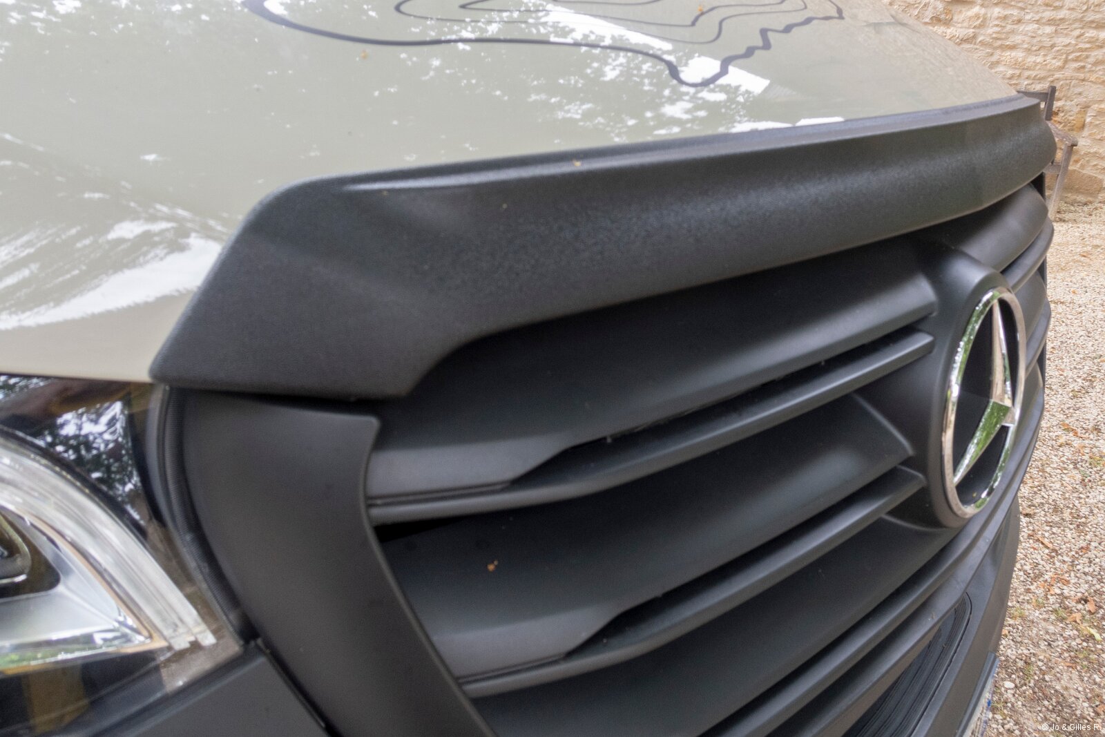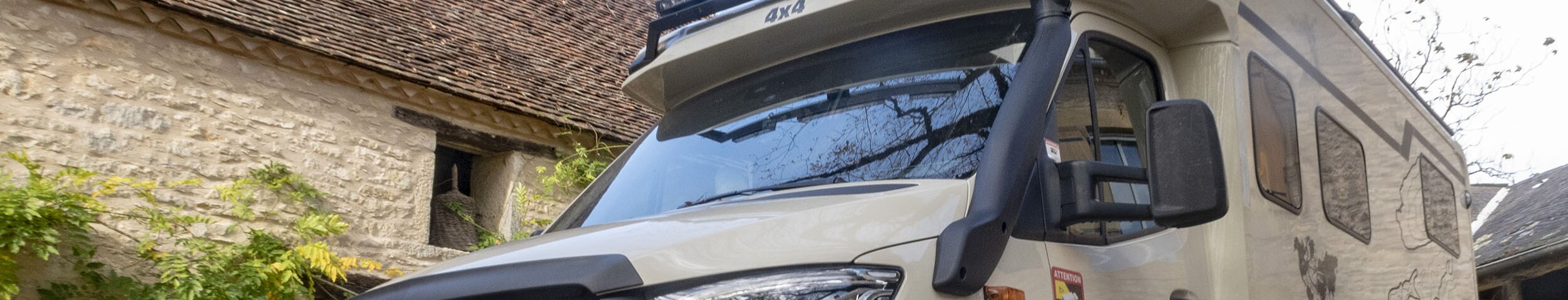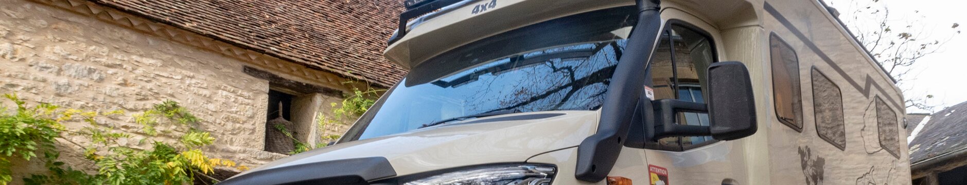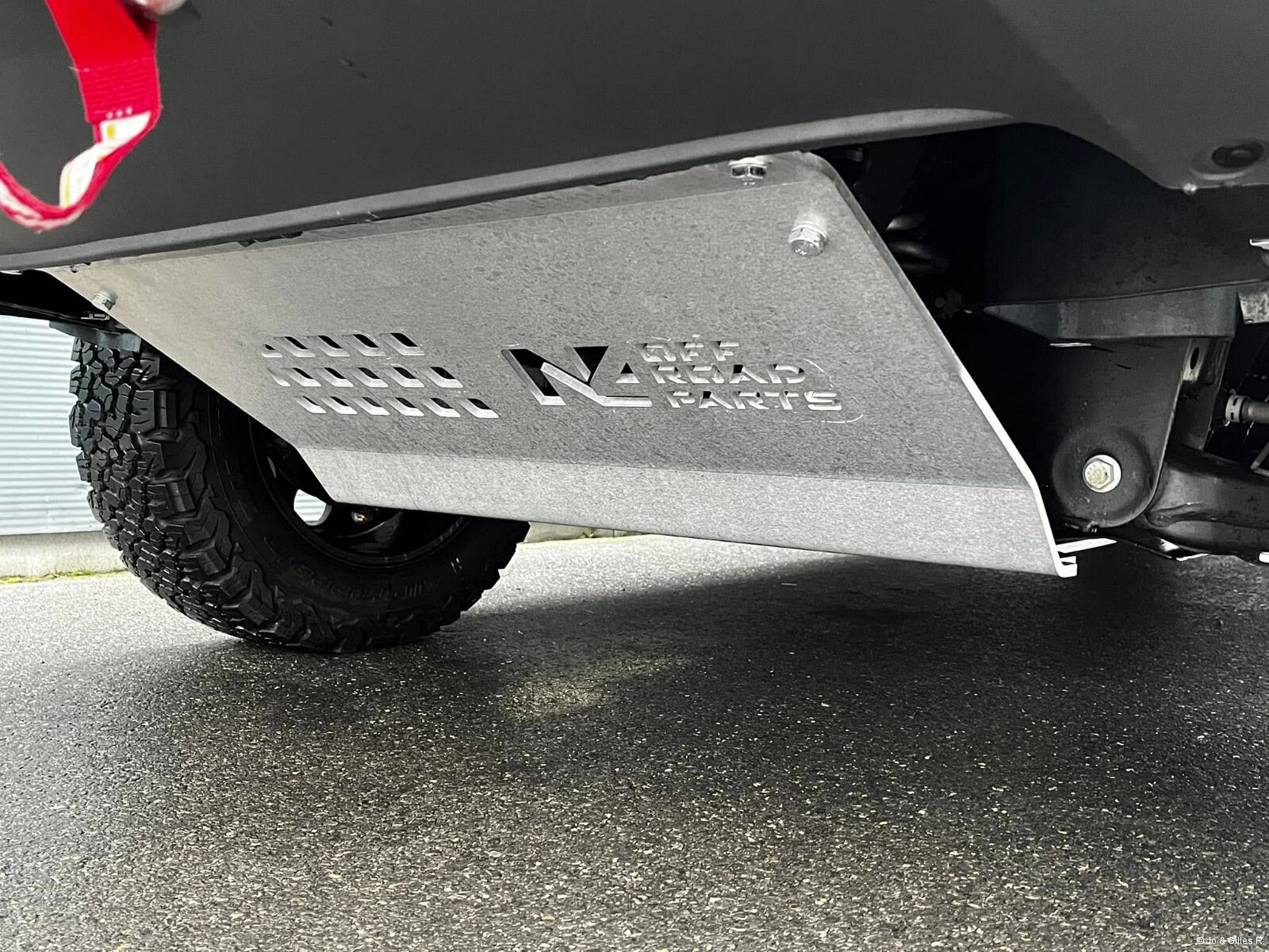 Quatre plaques de désensablage Maxtrax Xtrem + pelle Rhino. La roue de secours a été descendue de 25 cm pour abaisser le centre de gravité du véhicule.