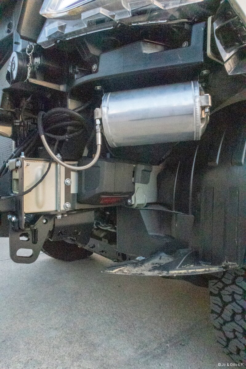 Réserve d'air comprimé placé dans l'aile avant gauche. Remarquez le crochet de remorquage.