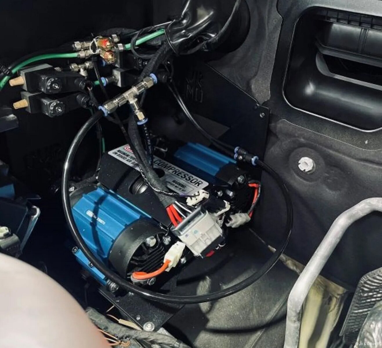 Compresseur embarqué dans compartiment moteur pour pression pneus, crick pneumatique et souflette de nettoyage.